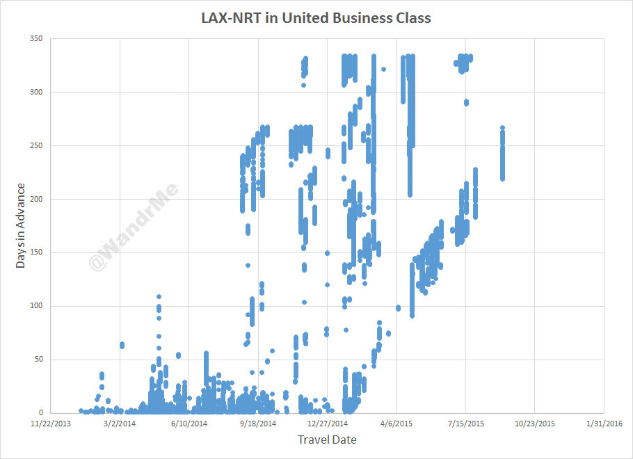 United’s flights to Beijing and Seoul have some interesting vertical lines showing blocks of dates which are not available for redemption. But, where they are available the Seoul flights seem to remain mostly available throughout the schedule, with an extra bump of inventory showing up around 74 days out and again around 14 days out..