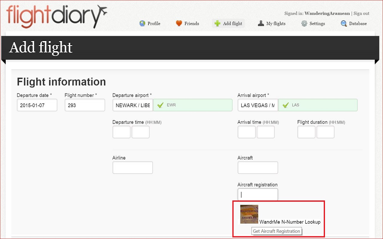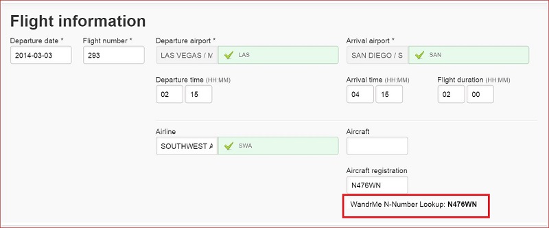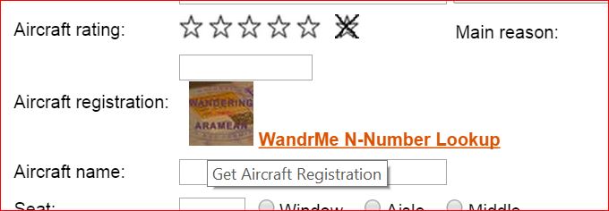 Both versions now will show on the Add Flight page of the respective site. This will only be useful if you’re behind in adding flights to your logs (the DoT data is typically 7-10 weeks delayed; January 2015 just came out this week) but the option is there. Click on the icon to populate the field. It will either put the registration number directly into the form for you or pop up an error message box.