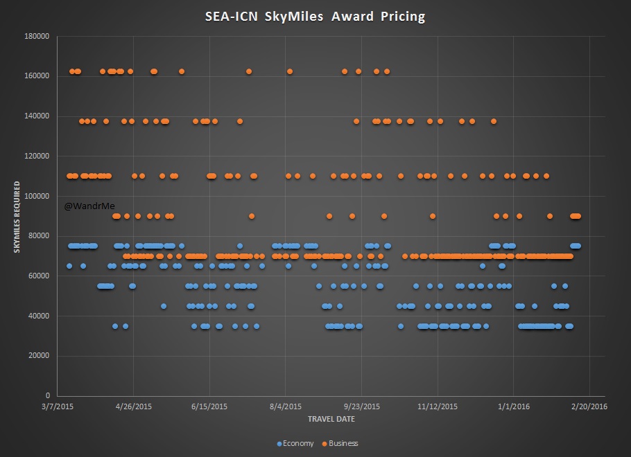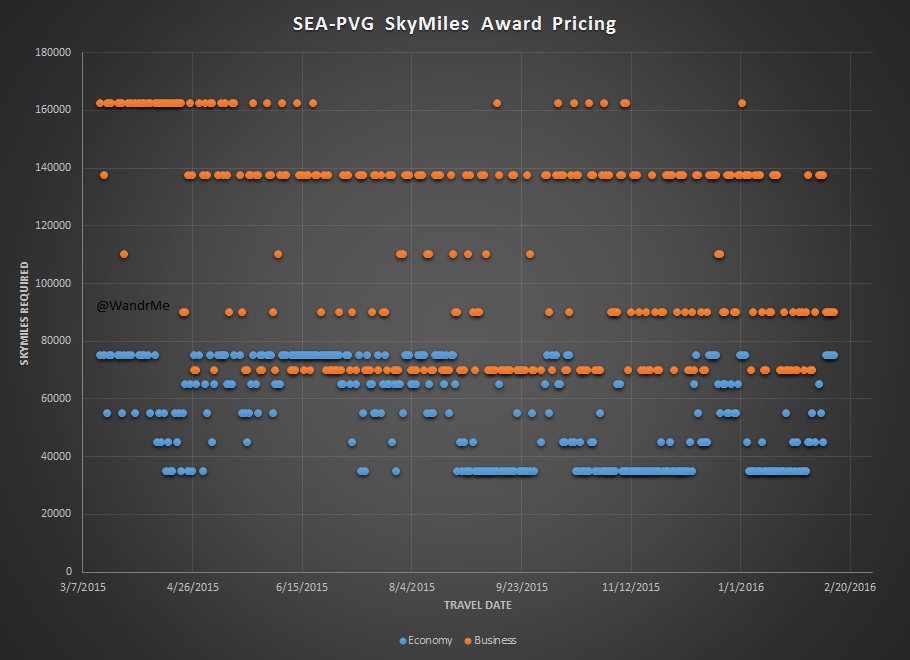 It is interesting to see that low level economy awards are less prevalent in most cases than low level business class awards. I think that speaks to the ability to sell the coach seats a bit more easily or to better absorb low fares there without disrupting the overall flight profitability curve the way discounting premium fares would.