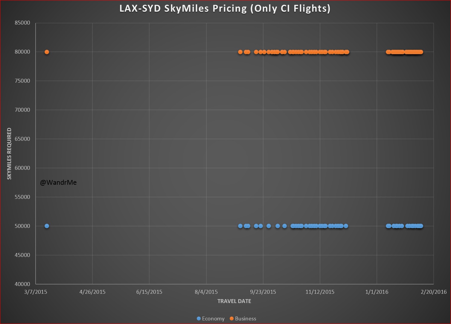 Yesterday I introduced a bunch of data related to Delta SkyMiles award availability and prices, focused mostly on the New York City market because, well, I’m biased towards where I happen to live. Several of you asked for other routes and markets and one of the more popular requests was for information about getting to Sydney on SkyMiles. I threw resources at that problem and came up with some data. I looked only at the Los Angeles to Sydney market because that’s the only place where Delta has service so it helps to temper the calculations and make for comparisons against partner inventory a bit easier.