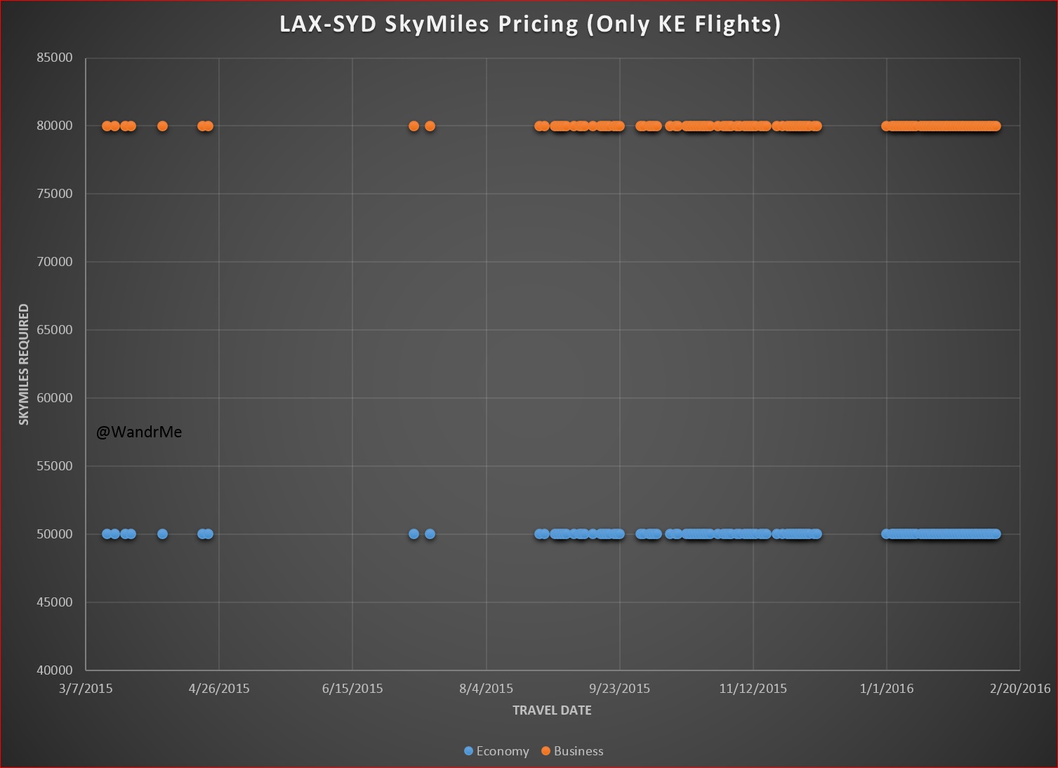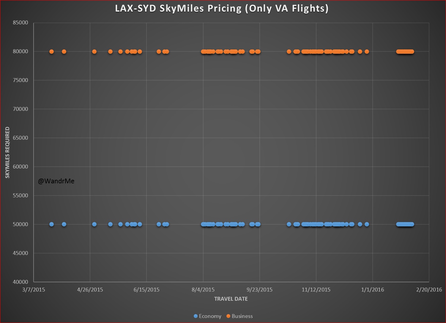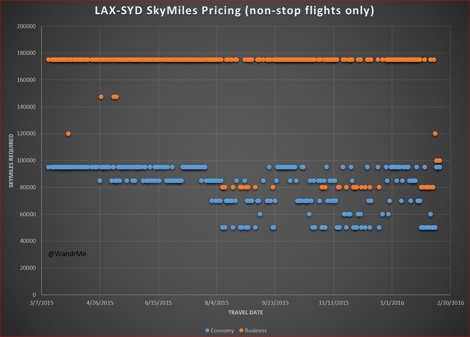 Want to get to Sydney non-stop from LA? Be ready to pay more or demonstrate some serious flexibility. Fortunately there are some dates with a seat available at the 50k level in coach or 80k in business but only about 10% of the time. Most dates with the lower level award prices involve travel on Virgin Australia, not Delta.