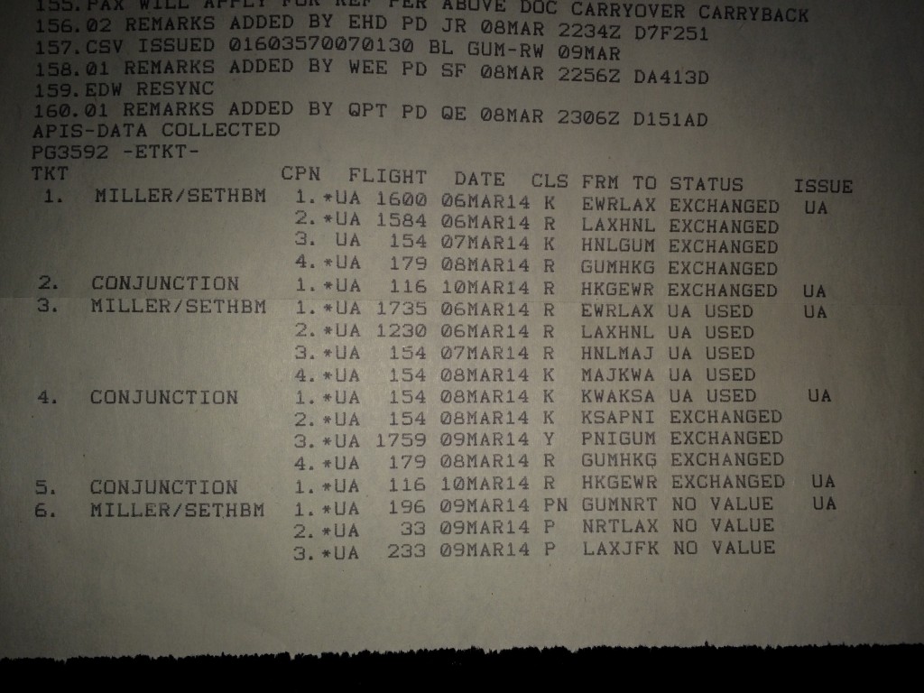 While stuck in Kwajalein there was a bit of time where we had wifi connectivity. Fozz was smart enough to use that connection and his T-Mobile calling plan to get us protected on alternate flights home from Guam, assuming we ever got there. The segments were added to our reservations but not issued as that had to happen in Guam.