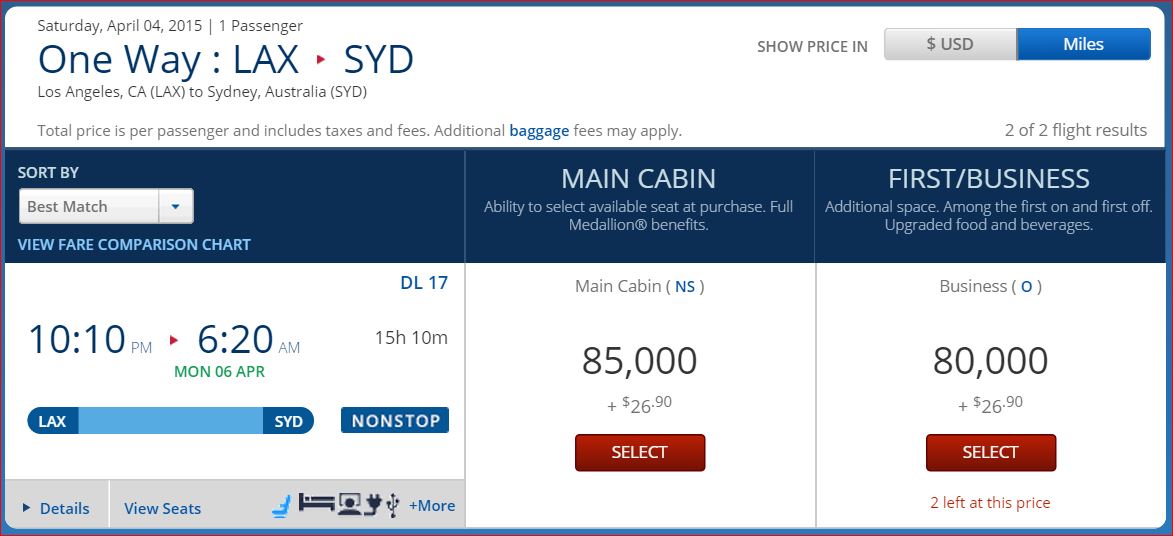 There are a couple quirks I noticed in the research this time around. If you’re willing to skip Easter this year two seats on the LA-Sydney non-stop flight are available on DL metal for only 80k each. That’s the low level award and something of a needle in a haystack type of find in this market. Also, it is less expensive than the coach seats on the same flight!