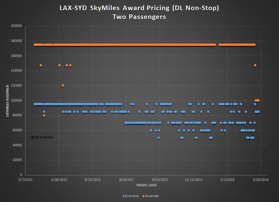 Last week I put together some numbers showing the challenges facing SkyMiles members who are looking to redeem points for travel to Sydney from the United States. Delta has but the one flight each day and availability is quite tight, particularly in business class. That research was based on only one passenger traveling. Many readers asked what it looks like if you’re not flying solo. Here’s what that looks like.