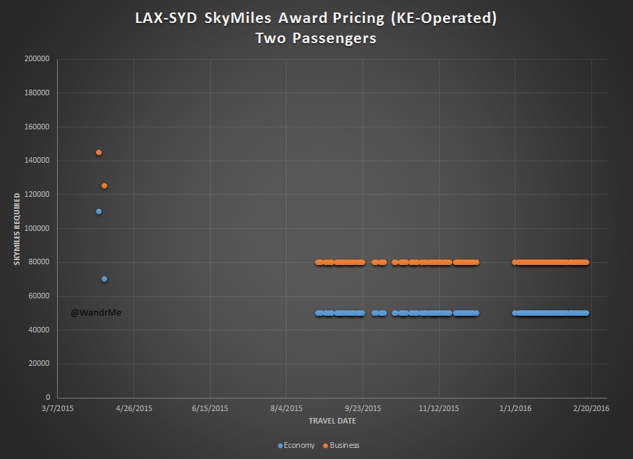 Yeah, still not great on the Delta non-stop flight. For a single passenger taking a connection made things better and that is still the case for two, but not nearly as many options remain. Pretty much only Korean is viable and with fewer dates than a single passenger would see. I’m not sure if Virgin Australia is missing because of a technical issue where nothing from Virgin Australia is showing up right now or something else, but I’m also not seeing single passenger options for VA-operated. There are very limited dates from China Southern and China Airlines with two seats, far fewer than for one (and so few I didn’t even bother graphing it).