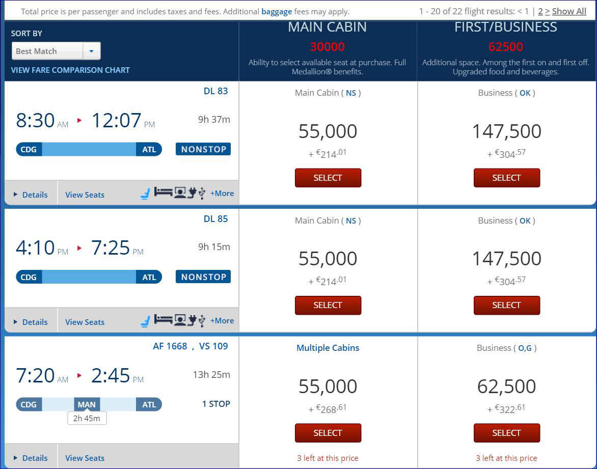 Perhaps the most significant feedback I’ve received since launching the HowManySkyMiles.com site is people asking about a way to show the results “live” as they’re searching for awards on the Delta site. It turns out that isn’t too hard thanks to the latest browser extension I’ve put together. When you run a search on the Delta site with the tool enabled it adds an extra row in the header of the search results with the details.