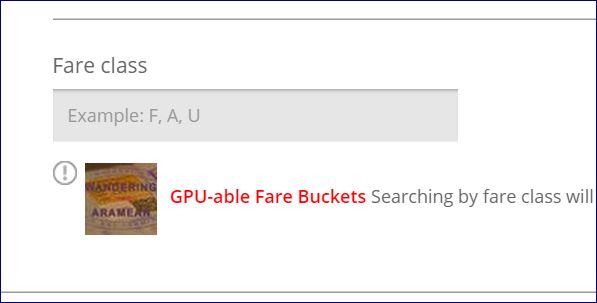 The gist of it is relatively simple: Only certain fare buckets are eligible for such upgrades and remembering the list is annoying. So is typing it in. The old version had the list always in the box and users would just click on a radio button to activate the function. The new version of the site operates a bit differently and therefore the add-in does, too. Just below the text box for Fare Buckets on the new Advanced Search page is an icon and a text link. Click on them and the text box gets filled with the correct text to search for GPU-eligible fares. Just like before it will put in different text depending on whether you are searching for an upgrade from economy to business or from business to first.