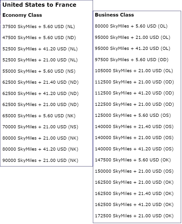 1. The chart shows 80,000 miles for US to France in Business Class, but I find one way awards for 62,500 miles. What is the actual amount for the lowest level?