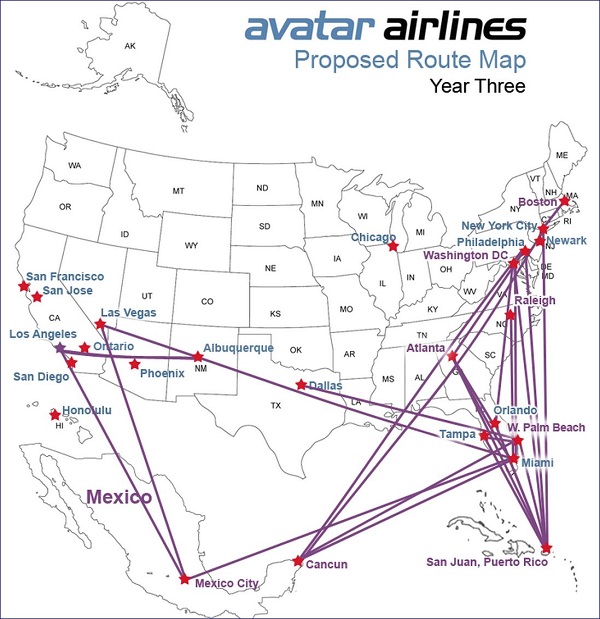 By the end of the first year, Avatar intends to purchase a total of 14 aircraft and add additional flights to and from Los Angeles, Las Vegas, Orlando, Dallas, New York, Miami, Chicago, Tampa, San Jose, San Diego, San Francisco, Phoenix, Philadelphia and Honolulu. By the end of the third year, Avatar expects to have a total of 30 aircraft and have applied for international authority.