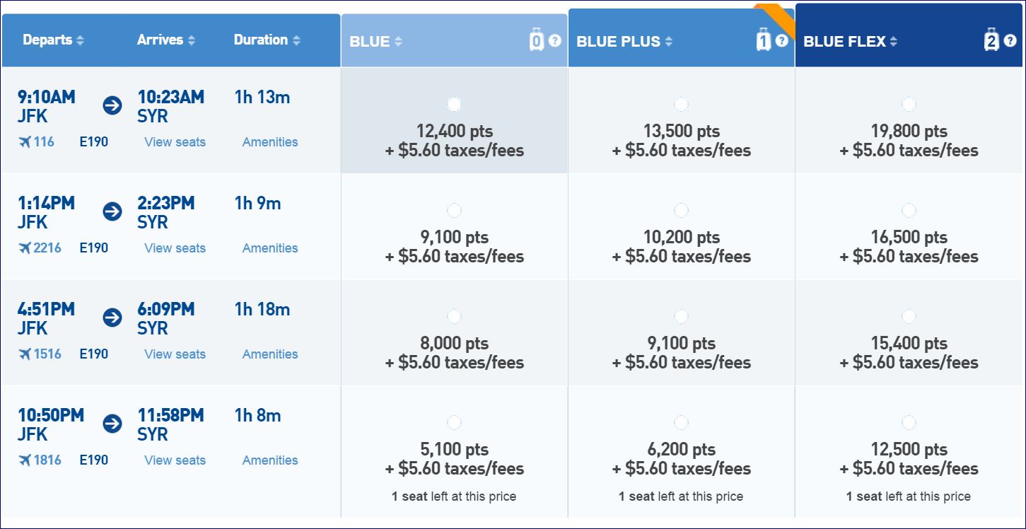 Still on the TrueBlue front, award tickets also come with the three different fare family options. The base points price is still variable based on the underlying fare and whatever other quirks the JetBlue algorithms put in place (my sample JFK-Syracuse flight ranged from 1.48-2.02 cents/point value) but the Fare Family premiums are fixed. Going from Blue to Blue Plus is 1,100 points and Blue to Blue Flex is 7,400 points. The point value for these upgrades is about 1.35 cents which is not tremendous, but there’s no way to mix-and-match cash and points so overall it is what it is. Buying Blue Plus of Blue Flex with points will reduce the overall value of your points in most cases but it may still be the smart decision based on bag fees and such. If you look at the trade-off of 1,100 point for one checked bag fee at $20 the value jumps up to 1.8cpp which is at the high end of the TrueBlue range.