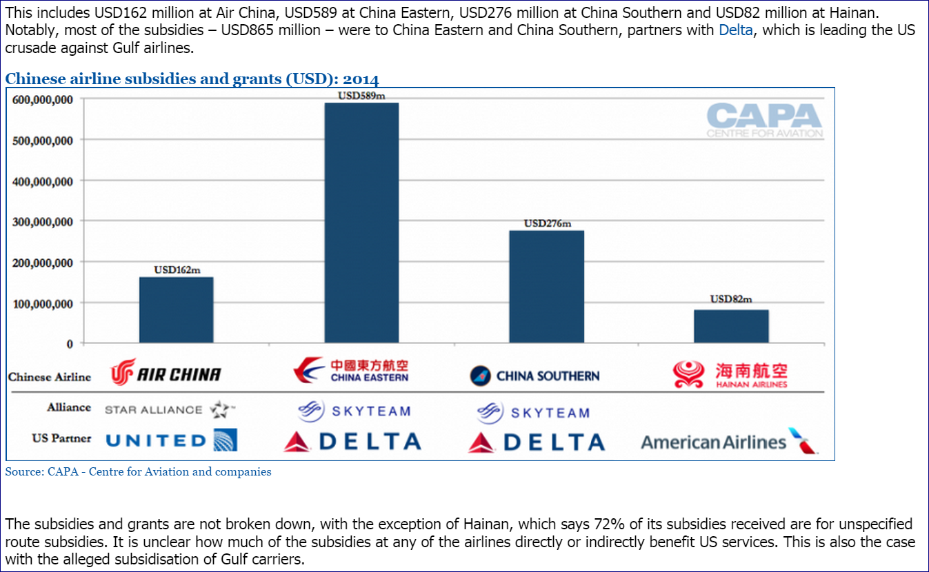 Excerpt from the CAPA report detailing the subsidies Delta's new partner China Eastern took in 2014
