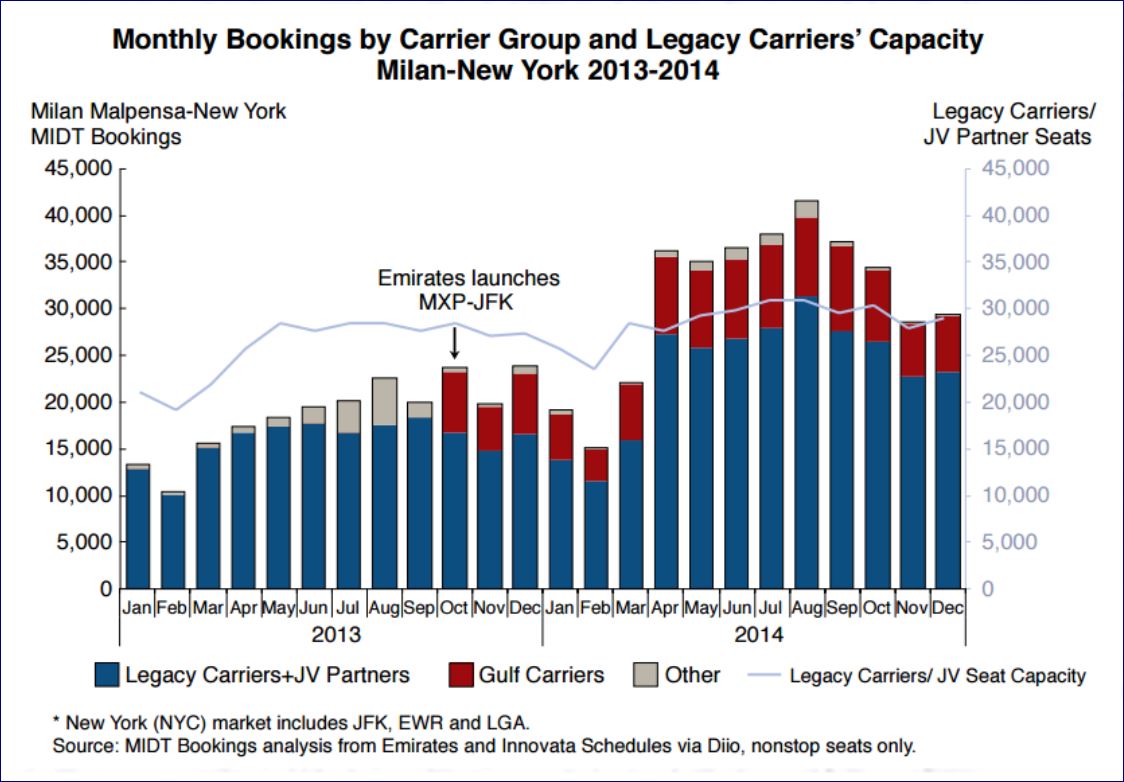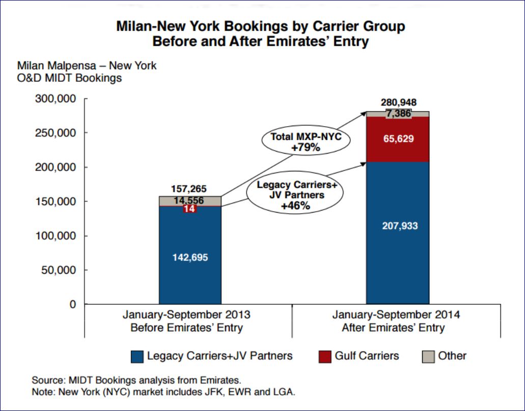 Indeed, the Legacy Carriers appear to presume their audience is unfamiliar with basic arithmetic: market share is only meaningful when considered in the context of overall growth or shrinkage of the market. In fact, market share figures are highly misleading here, because Emirates’ entrance into the New York-Milan market has stimulated overall demand for the market. Since Emirates’ launch in October 2013, total bookings for New York to Milan routes increased by nearly eighty percent.