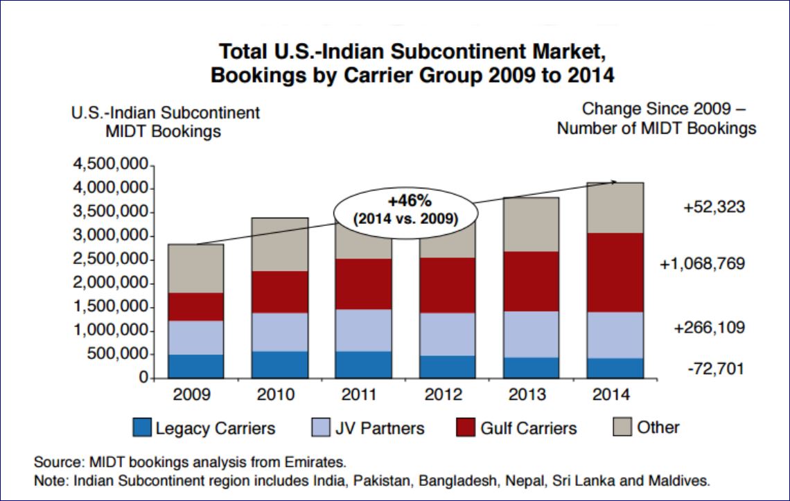 The Legacy Carriers’ Compass Lexecon Report asserts—with no explanation or documentation—that “two of the three U.S. carriers were forced to discontinue their non-stop services between the United States and India” as a result of the growth of Gulf Carrier bookings to the region. It is odd that such a strong conclusion of cause and effect is advanced with no support whatsoever. It is particularly odd in light of the fact that the supposed competition for the Legacy Carriers’ discontinued non-stop flights consisted of the Gulf Carriers’ one-stop flights. A closer look at the fact casts grave doubt on the assertion that these cancellations were caused by competition from the Gulf Carriers.