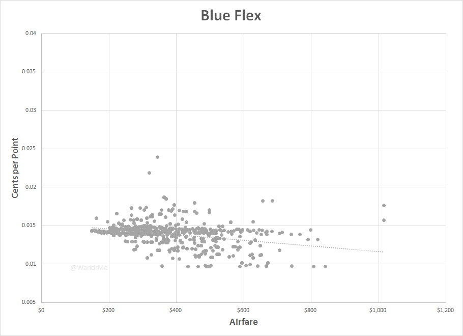 And, in what I believe is a mistake in the pricing algorithm, there are about 10% of the data points where the value of a TrueBlue point increases for the Blue Plus or Blue Flex rewards. There are even a small handful (~2%) of cases where the total points required for a Blue Plus redemption is lower than for a Blue redemption. I didn’t find a pattern for that but it is there.