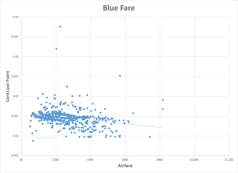 Moreover, redeeming for the more expensive fare families generally brings down the value of the points overall. In 90% of the data points the value per point of a Blue Plus redemption was lower than that of a Blue redemption. The average point value for moving from Blue to Blue Plus is 1.08 cents, a 30%-ish discount from the average value of the points overall. Still, that’s about 1200 points on average to get a checked bag as part of the itinerary which is likely the smart play, even at the lower valuation, just based on what it would cost in cash to buy it separately, a price which is generally higher than just the fare difference.