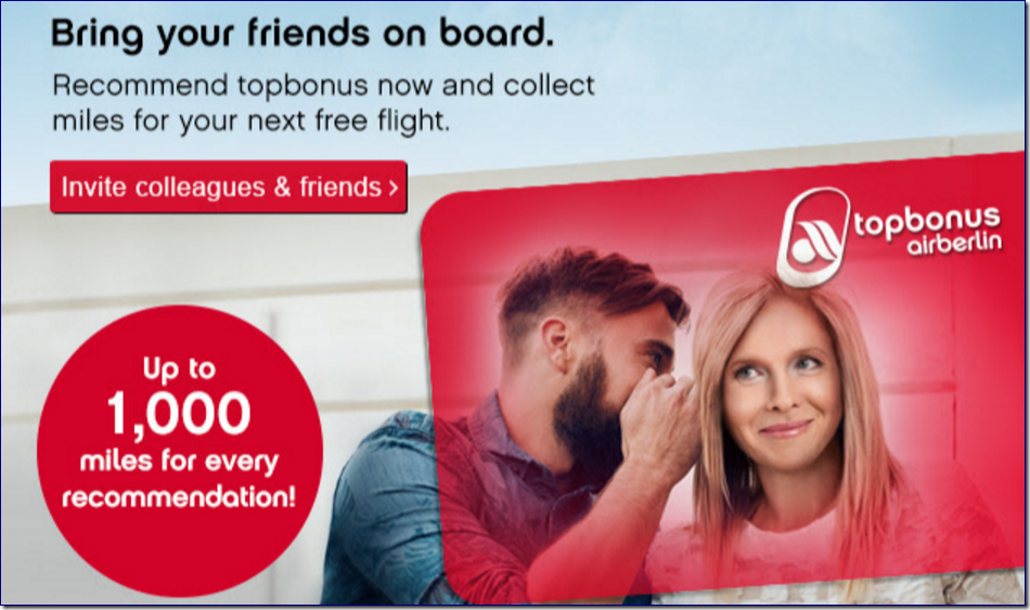 Want some free Air Berlin TopBonus points? If you’ve got friends who you can convince to sign up for the program you can collect up to 9,500 between now and the end of July. The program is running a 2x bonus right now for new referrals, offering 1,000 points per new sign-up, starting with the second one secured during the promo period with a cap of 10 invitees per year per member.