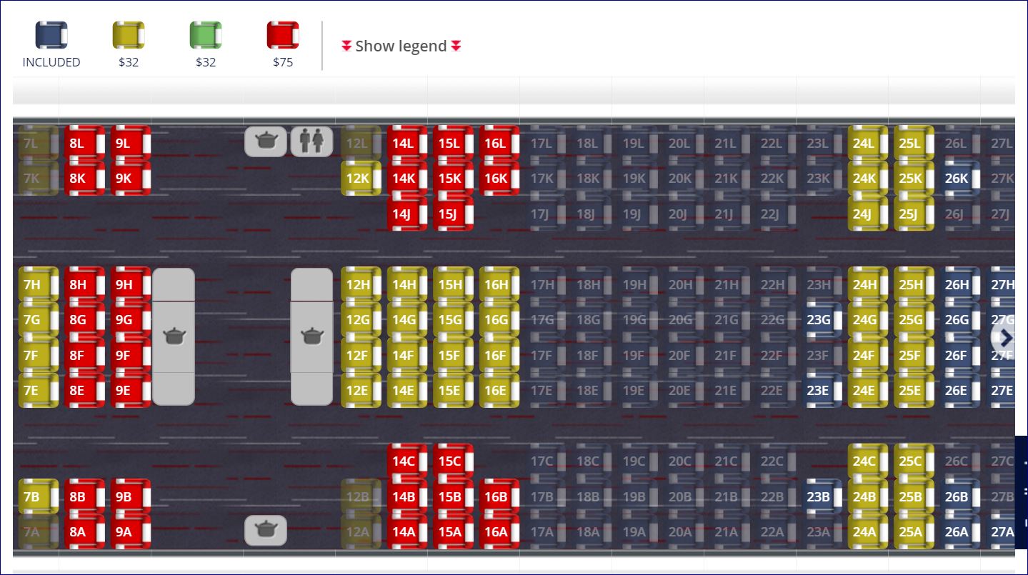 Directly behind the second door is four more rows of economy seating where the other 772 layout has three rows of business. Two of these are also in the 2-4-2 layout while the other two are in a 3-4-3 arrangement. The outside seats are considered “Seat Plus” with extra legroom while the middle four column is not, suggesting that the rows may be misaligned.