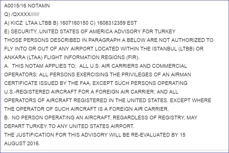 Following Friday’s attempted coup in Turkey the US Government has implemented a NOTAM altering a number of flight authorities. From the statement from the US Embassy in Ankara: