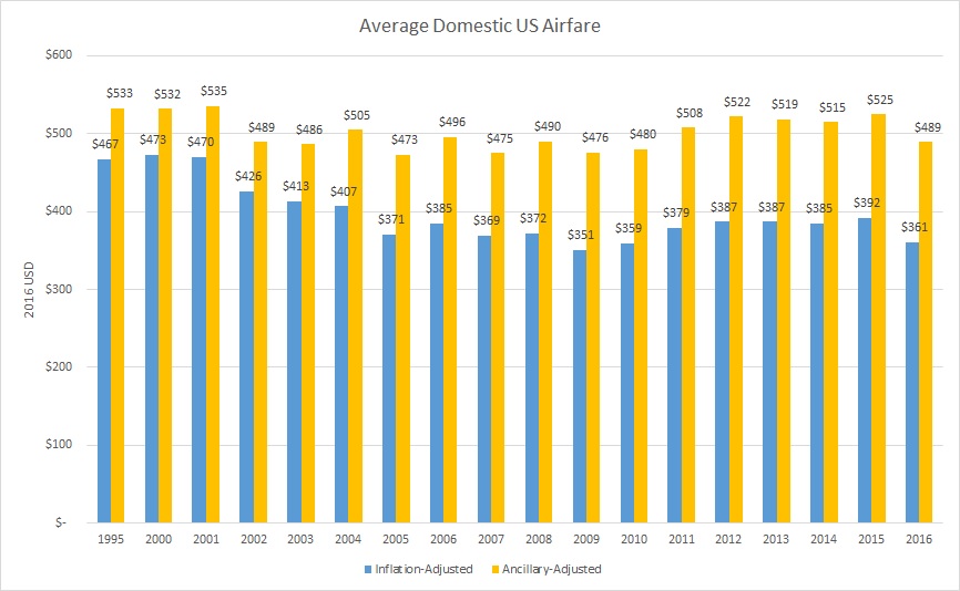 In the same release the BTS also shared data on “Revenue from Passenger Fares as Percent of Total Scheduled Passenger Airline Operating Revenue,” a key factor given the rise of ancillary fees in the US market over the past decade. In 2000 airfare was 88.9% of the total passenger revenue for reporting airlines; that number dropped as low as 73.7% in 2009 and hovers just below 75% today. This suggests that historical airfare data should be adjusted not only for inflation but also for the proportion of costs those ancillary fees represent to come up with a better view of what the true impact to travelers is. Here’s what that graph looks like: