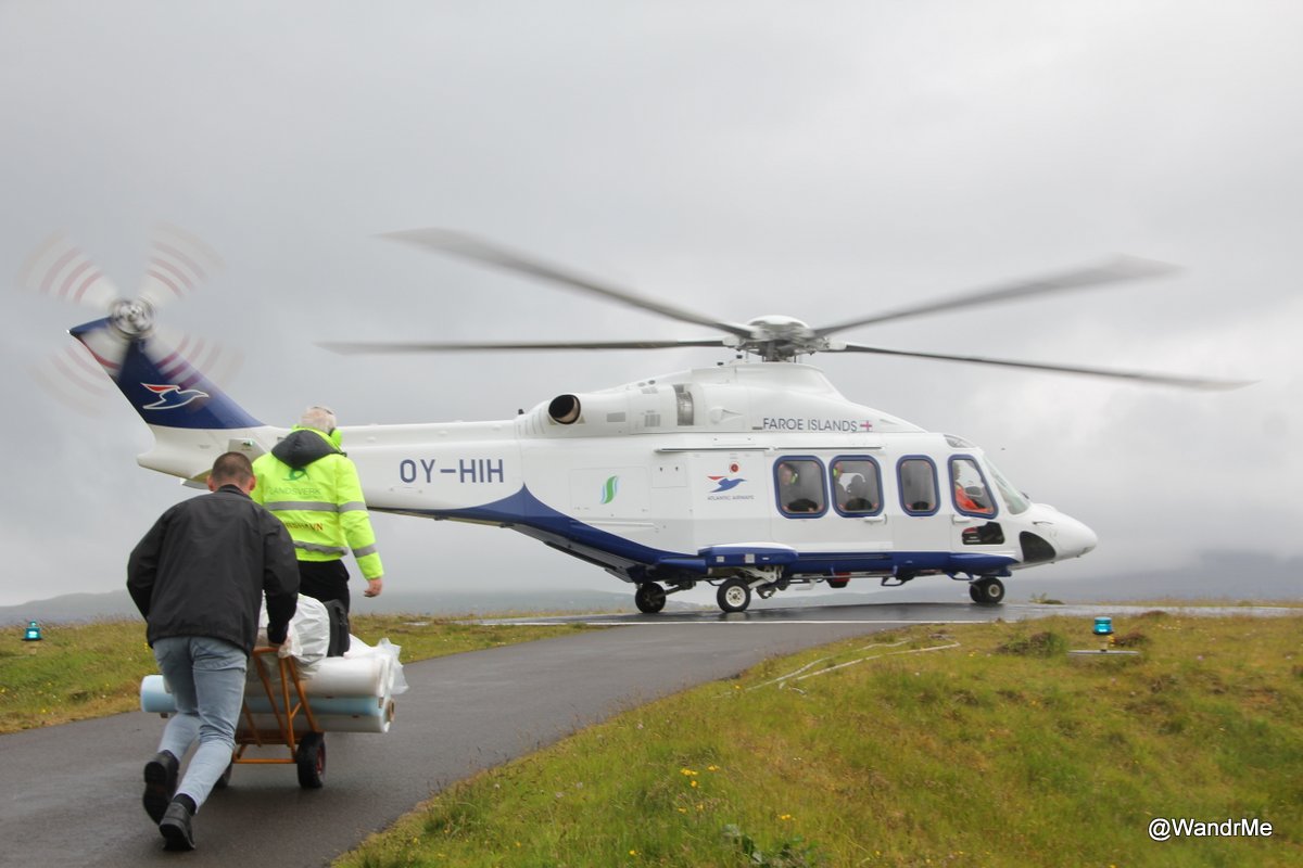 Ship OY-HIH is an Augusta Westland 139 fitted to carry 15 passengers. On a full flight that would translate into a tight squeeze; fortunately for us only seven were flying our day so window seats were easy to come by and space was plentiful. Our routing was advertised as two stops from Tórshavn, hitting the small islands of Skúvoy and Dímun en route to Froðba. No one booked the Skuvoy stop so we over-flew it, going straight to Dimun.