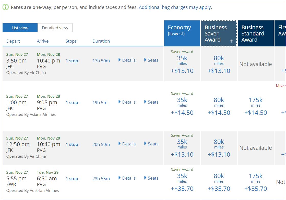 I’m booking a trip to Shanghai for work and the idea of connecting in Taipei en route seemed like a good idea to me. A search from NYC-PVG had many options but the EVA Airways routing was not listed. Searching for JFK-TPE brought it up and I could also get from there to Shanghai, though only in economy class rather than business. That’s a mixed cabin, saver level award that should price as 80,000 points. The United website wanted 95,000 for my trip.