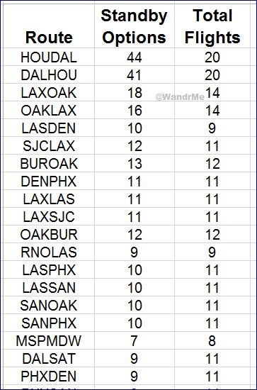 Not surprisingly, the routes where standby will work well are heavily focused in Texas and California where the carrier has several routes with very high frequencies. Between Houston and Dallas there are more than 40 flights each direction within the 2-hour window, allowing for easy standby option, though not more than 40 daily flights. They are so closely bunched that a booking on one could leave multiple other standby options available. With five flights from Atlanta to Fort Lauderdale on Monday only the first two are within the 120-minute window, meaning an A-List booking on the 10:50a flight could potentially catch the 8:55a for free but booking on the others leaves no free standby options; that is far less useful for most travelers. Here’s a list of the top 20 routes for standby travel in terms of options relative to total flights and also the worst for such.