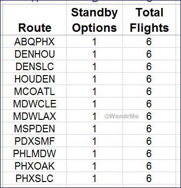 On Monday, September 19, 2016 Southwest Airlines has 3,710 flights scheduled covering 1,236 routes (I’m counting A->B and B->A separately since the flight times will vary between them, affecting standby options). Of those, 399 routes are only flown once daily so they are immediately eliminated from consideration. That leaves 837 other routes to consider. Of these only 232 have multiple flights spaced within the 120 minute window that allows for standby travel. That’s only 18.77% of routes where the new benefit is viable at all. Those 232 routes have a combined total of 908 flights a traveler could be booked on and conceivably catch an earlier flight for free, nearly 25% of the flights in the system. The 232 routes cover 52 departure airports.