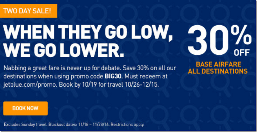 Promo code is subject to limited availability and is good while limited supplies last until 10/19/16 (11:59 PM ET) for 30% off the base airfare of a domestic or international one way or roundtrip JetBlue flight (nonstop or connecting) originating from the United States (including Puerto Rico) to any JetBlue city between 10/26 – 12/15/16 (Excludes Sunday travel. Blackout dates: 11/18 – 11/28/16). Customers purchasing roundtrip travel must select both outbound and return flights within the travel period in order to receive the discount. Code is valid only for flights purchased on jetblue.com/promo; new bookings only; limit one code per booking. Code is not valid in connection with multi-city bookings, JetBlue Getaways, Mint fares, award flights, taxes/fees, partner or code share or interline flights, baggage fees, or any other products or services.
