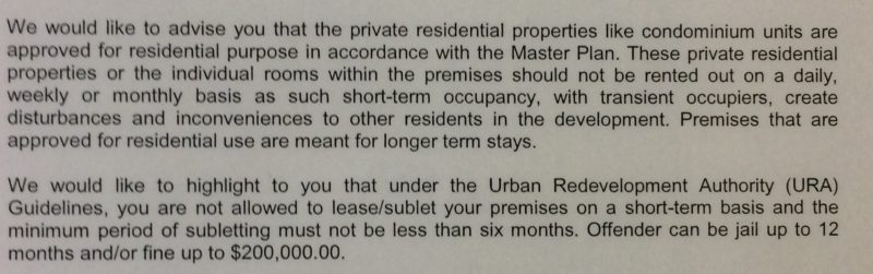 We would like to highlight to you that under the Urban Redevelopment Authority (URA) Guidelines, you are not allowed to lwase/sublet your premises on a short-term basis and the minimum period of subletting must not be less than six months. Offender can be jail up to 12 months and/or fine up to $200,000.00.