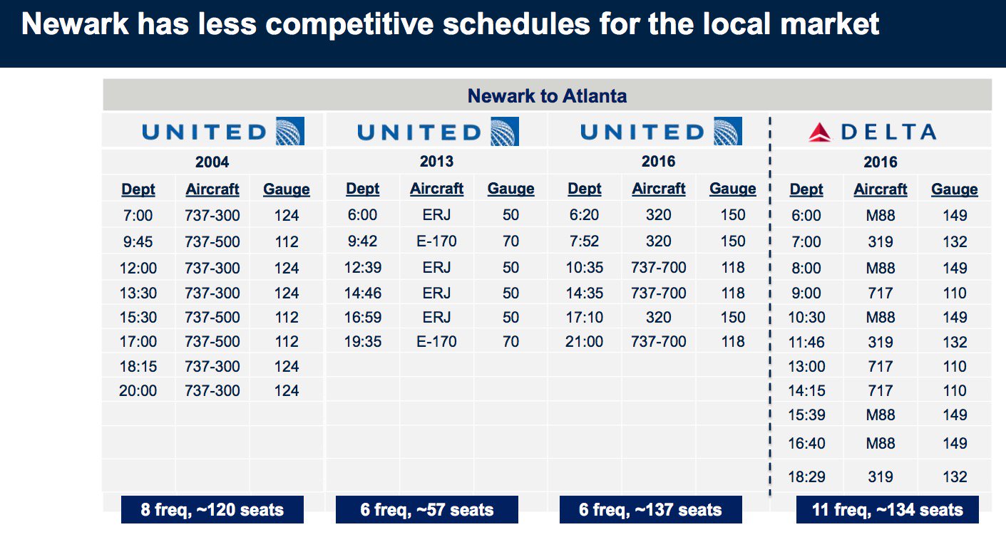 It also doesn’t address the challenge United faces in the 100-130 seat jet market. The investor briefing included a slide showing how Delta Air Lines is often able to put more frequencies of mainline jets, albeit sometimes smaller ones, on routes, offering up more flexibility for business travelers on various routes (Newark-Atlanta was chosen in the slide). United has fewer total flights but more seats.
