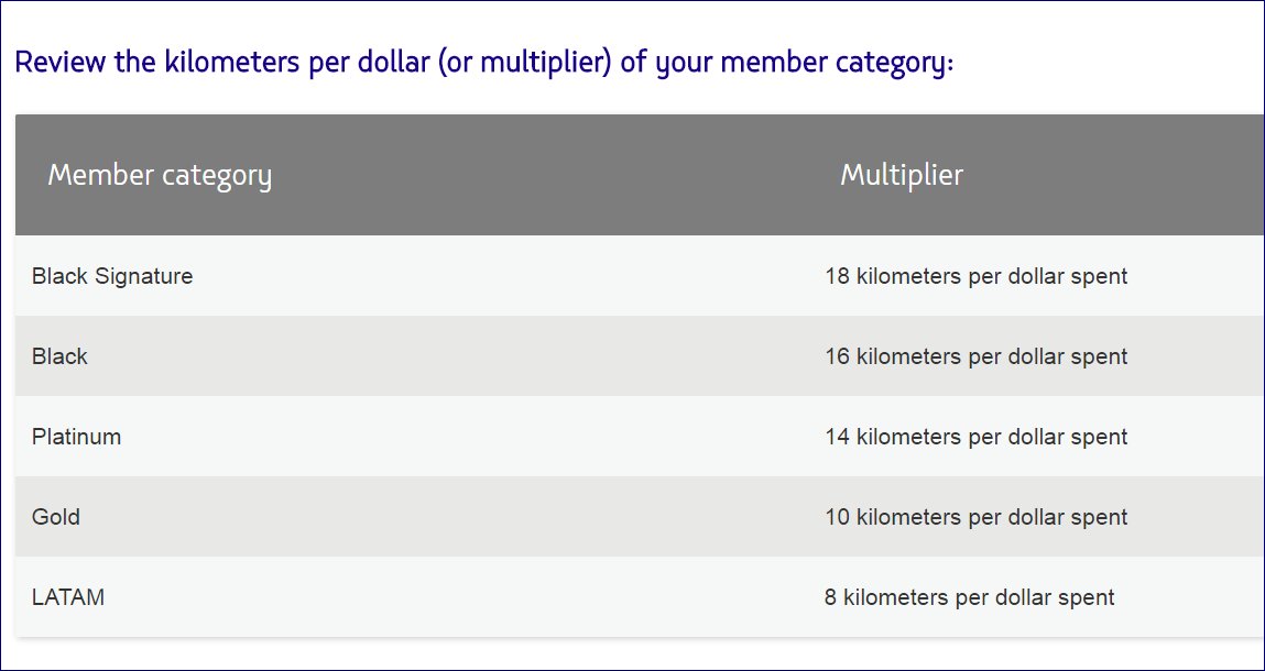For award mile earning the numbers are generally the same as what the US-based carriers have adopted with a base of 5 miles per dollar (converted to 8 kilometers because that’s how the LATAM program measures). From there different status tiers wearn more, with the top tier Signature Black earning 18/$. For the Black and Platinum tiers used to earning the same bonus points as Black Signature members this is likely to be a disappointment as they’ll earn less under the new scheme.