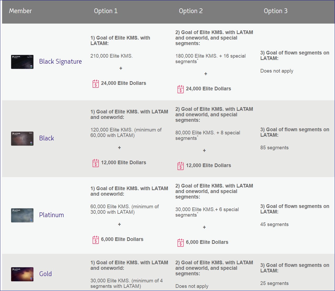 At the lowest level the earning requirements are 30,000 kilometers across all partners (minimum 4 segments on LATAM metal) or 25 segments on LATAM-operated flights. From there things get complicated.