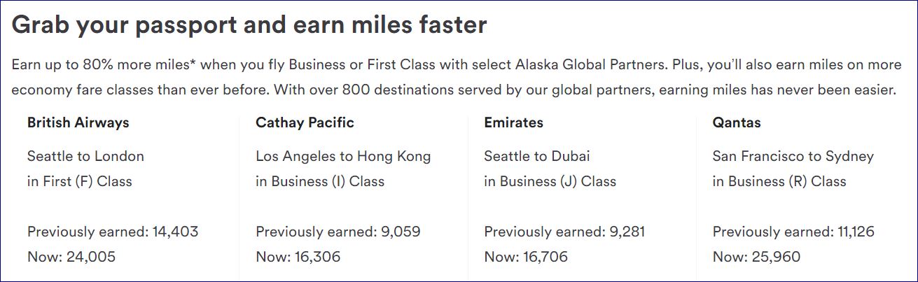 Premium cabin partner travel just became more lucrative when crediting to the MileagePlan program. Alaska Airlines will now give more points for business and first class flights on Qantas, Emirate, British Airways, Cathay Pacific and more. The company is advertising “up to 80%” more miles” but also includes an example on Qantas where the earning 133% higher. Mostly good news even if bad math in the marketing copy.