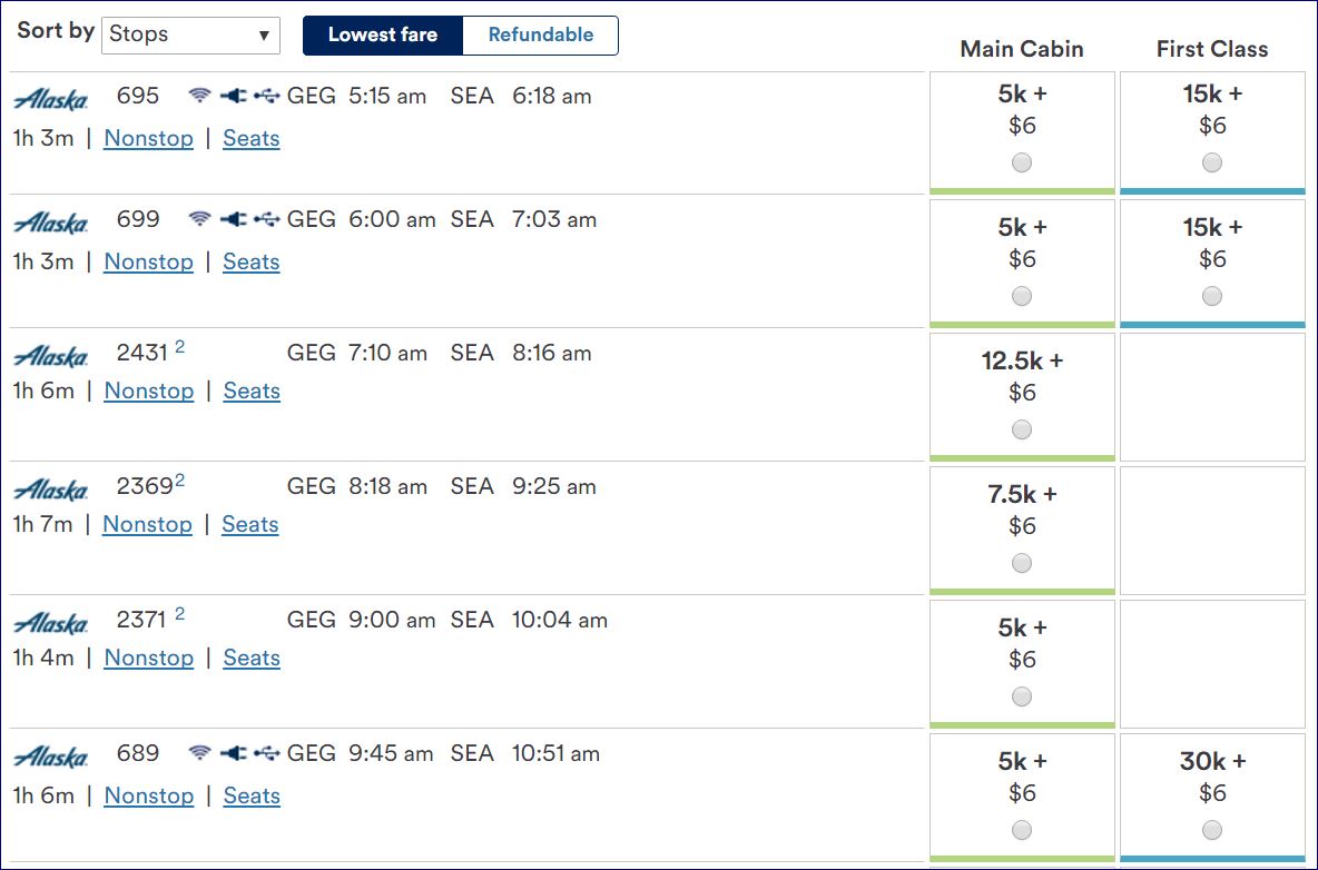 Key to this change is that it is the starting point for awards, not necessarily what MileagePlan members should expect to pay on any given day. Searching on Spokane-Seattle, for example, yields awards priced at 5,000, 7,500 and 12,500 point levels, plus the refundable option at 17,500. On Portland-Seattle – also theoretically a 5,000 point award – rates appear to be mostly 10,000 or 20,000 points for a one-way trip. This variable pricing is both good and bad news. Alaska Airlines has not gone so far as to implement a completely variable priced award structure.