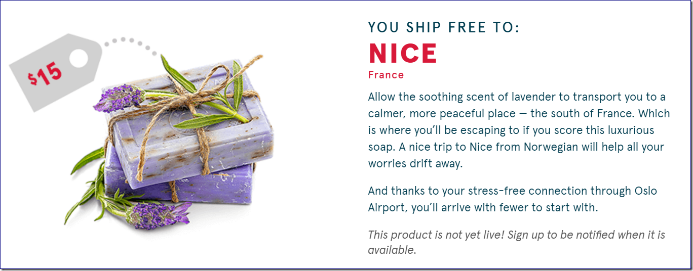 Odds of winning are spectacularly low – only 20 prize packages to be given out overall – but I am impressed by the Christmas promo Norwegian Air is running this year. Every three hours, from noon to midnight EST, through 20 December 2016 the company will advertise a destination on the Best Free Shipping on Earth website. Technically they’re advertising some sort of product from the destination, like paprika from Hungary or lavender soap from Nice. But the “free shipping” part is that the airline will send you and a guest to the destination to collect the goodies. YOU are the free shipping. Oh, and you don’t actually have to pay the price listed either. It really is just free.