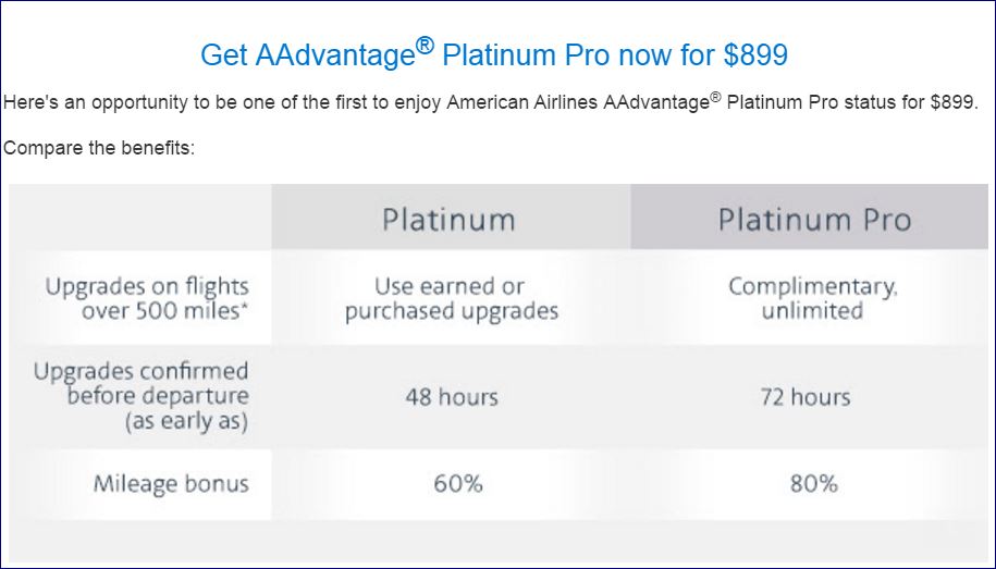 This week American put Platinum Pro on sale, sending emails to members with the opportunity to buy access to the new program tier. Reported prices range from $800 to more than $1500 (my offer was $899) and the purchase allows members to immediately realize the benefits of the new status level for the duration of the 2017 program year. Such buy-up offers are common for the AAdvantage program. They are not reserved only for the year-end “near-miss” members and the variations in pricing and tiers suggests that the company is actively testing customer thresholds and motivation factors. And I’ve never been less interested in such a purchase than I am right now.