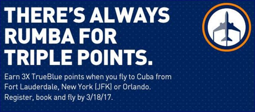 Planning a trip to Cuba before March 18, 2017? Flying on JetBlue can earn you triple TrueBlue points for that trip. The company announced the new promotion this morning and registration is required before purchasing tickets.