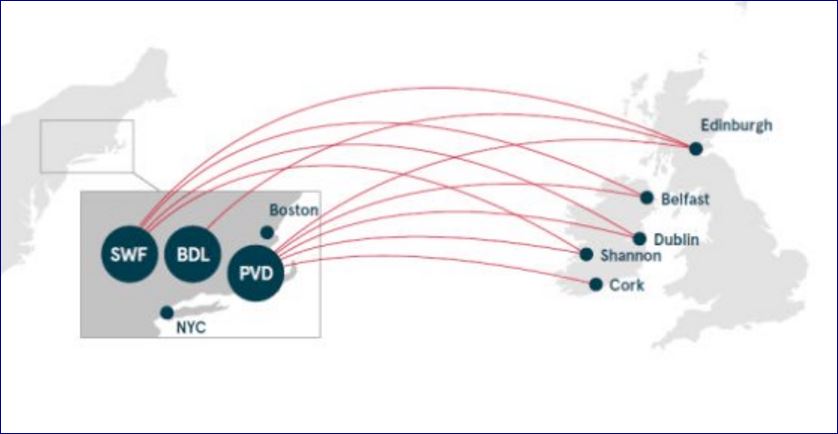 Dublin, Edinburgh and Shannon have proven demand for Transatlantic service, though a significant portion of the Dublin traffic is connecting onward in Europe. On the US side Hartford just recently added Dublin flights while Providence has service from Azores Airlines and Cabo Verde Airlines. Providence also recently had seasonal service from Condor Airlines but that was not renewed after the 2016 season.
