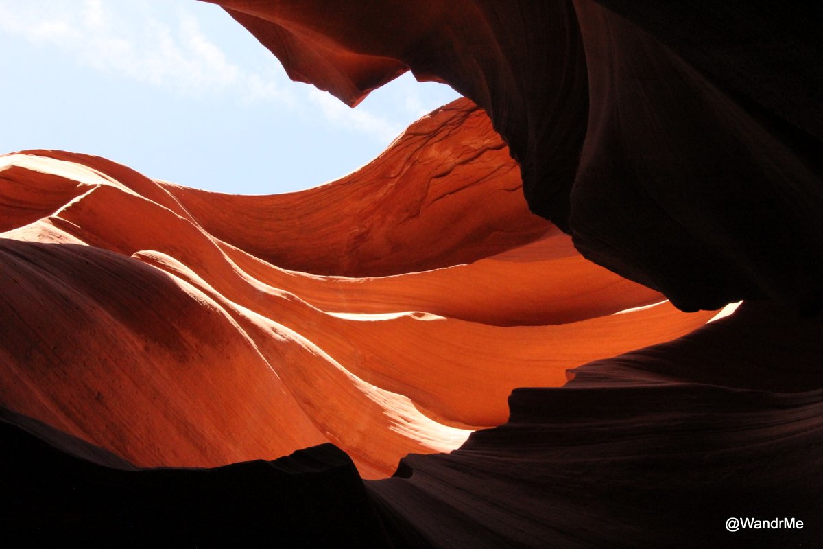 The shape of Lower Antelope Canyon is such that more sunlight reaches the bottom and sky is visible more frequently. That means fewer chances for the infamous spot beams of light but overall better lighting inside to capture the color of the rock walls.
