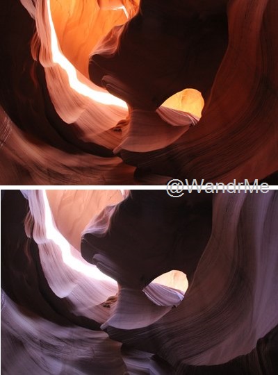 One interesting quirk of those colors is what different white balance settings on a camera can do to skew what is recorded. For a SLR camera our guide suggested recording in “shade” mode; on an iPhone the Chrome tonal filter is recommended. At one point in Lower Antelope Canyon I snapped the same shot with two different white balance settings. The difference is stark but both are real.