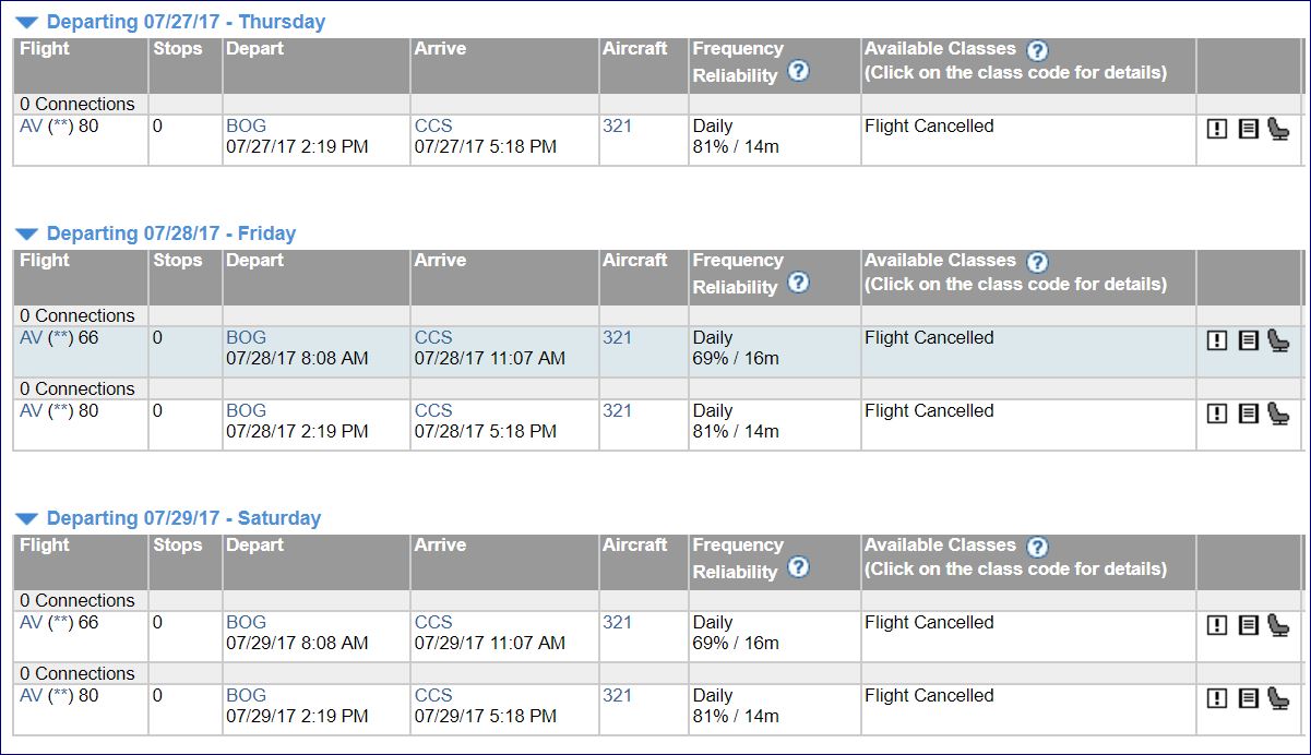 I still believe the Avianca cancelations are more significant than Delta’s for several reasons. It is more flights and a closer neighbor moving more connecting passengers in and out of the country. Caracas is down to about 50 arriving flights each day from what I can see. Long-haul service from Lisbon, Paris, Madrid and Istanbul (via Havana) continues but not daily. But only about a dozen of the arriving flights each day are flown by foreign carriers. The Venezuelan operators will continue to fly, assuming they can pay for services and fees in hard cash at the foreign airports, but it is unclear how much longer that will happen.