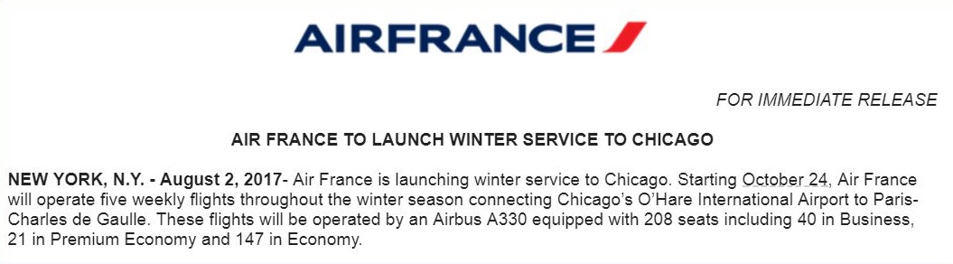 And someone at Air France figured out that this was confusing; the web version of the release was updated to read “Air France Continues to serve Chicago” rather than suggesting it is a new service launch.