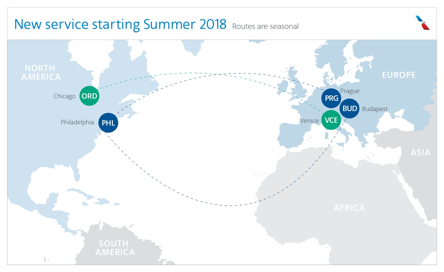 Secondary European markets are getting a boost from American Airlines next summer. Three new seasonal routes are being added serving two new destinations – Budapest and Prague – and increasing service at Venice for the season. The new service will operate between May 4, 2018 – Oct. 27, 2018.