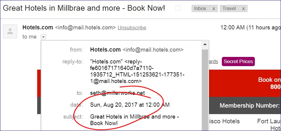 And my search pattern there, consistent with most other day-of bookings, includes a few different OTAs plus direct booking options (mostly via Hotel Hustle to quickly compare). Thanks to the reasonably generous Welcome Rewards program Hotels.com is one I always consider. And, of course, the searches include the desired travel dates because that’s the only way to get the right price. Which means that Hotels.com knows I wanted a room at SFO last week. But that didn’t stop the company from emailing me twice this week, trying to get me to book a room for my stay last Thursday night.