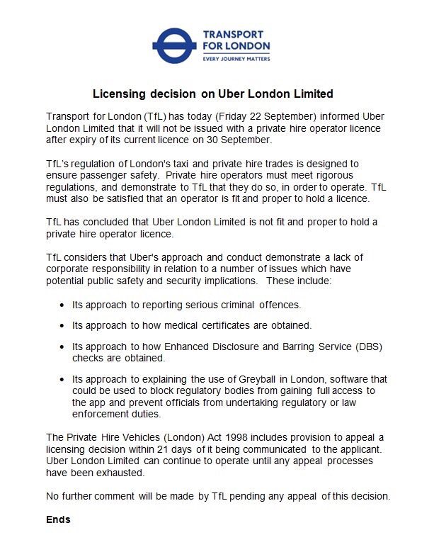 I’ve said this in numerous places: I think this is key ==> “Uber’s conduct demonstrated a lack of corporate responsibility which could have potential public safety and security implications” — and it will be an interesting narrative. Uber has done itself no favours on a corporate or local level over the past year.