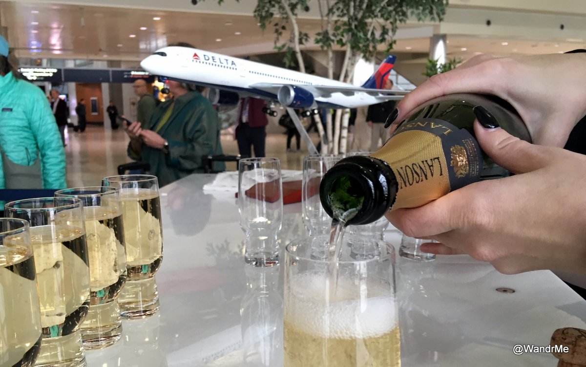 Festivities kicked off in Detroit with a “First Flyers Club” lounge area near the boarding gate. Delta offered pre-flight champagne and a travel wallet to passengers on the flight. A brief set of remarks were made at the gate – smaller than I expected given the significance of what the A350 represents for the company – and then boarding began.