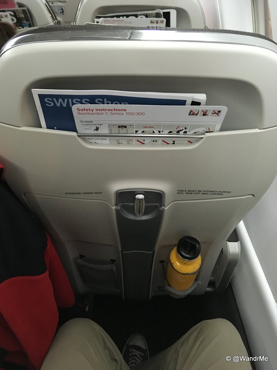 The ZIM seats won a Crystal Cabin Award in 2014 and are now flying in the CSeries for Swiss. The center column for the tray support is unique and has advantages (mostly on the maintenance side) and disadvantages (mostly on the how to store stuff in the seat back pocket side). I got a water bottle in but that’s about all. Still, it is a comfortable seat with good padding and, thanks to the CSeries design, plenty of width. Added bonus was an empty middle seat due to light loads but that’s less significant on this aircraft than a 10-abreast 777.