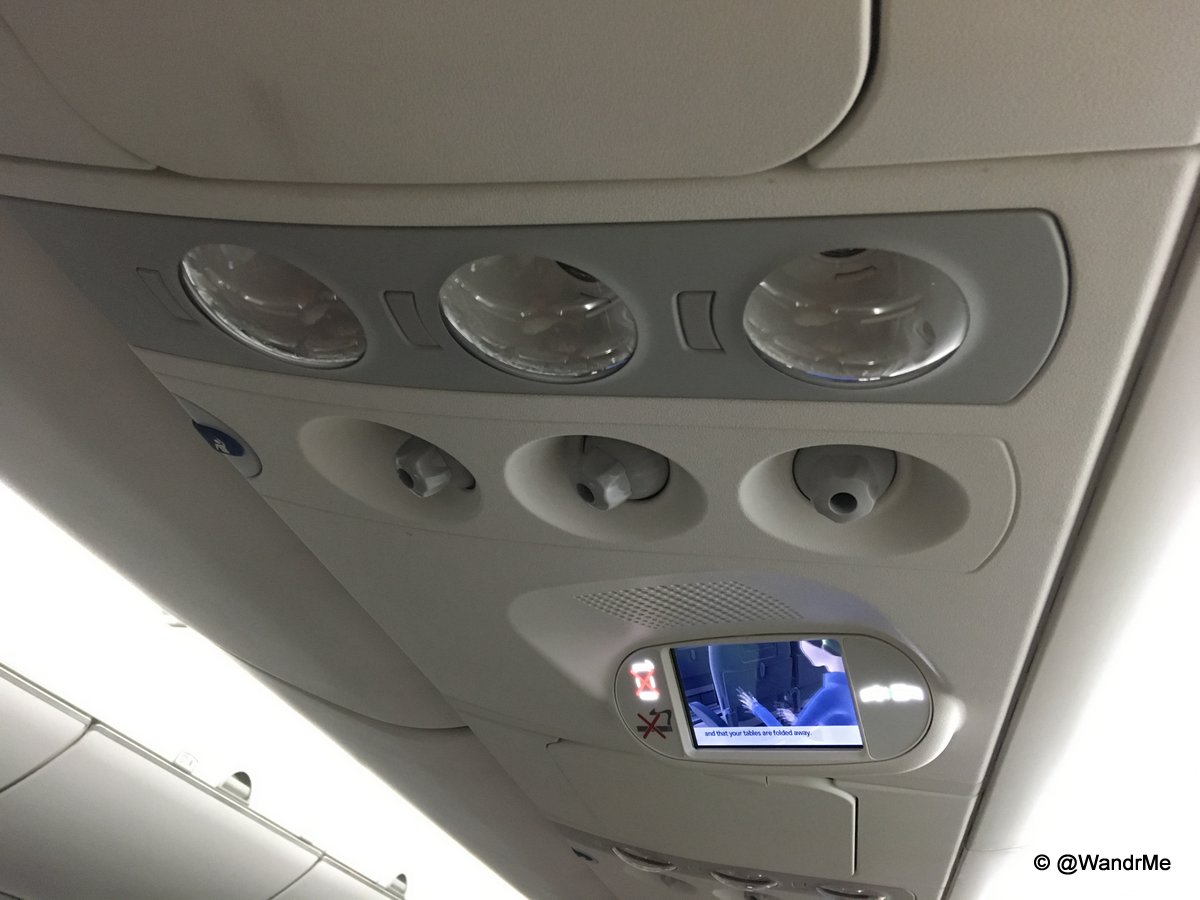 There’s also an adorably tiny screen in the overhead panel that is used to show the safety video and a moving map during the flight. I’m not entirely sure how it qualifies as large enough to be visible for all passengers on the safety side of things but the fixed position (rather than flip down) makes it lighter, cheaper and more reliable than traditional, larger screens to be sure.