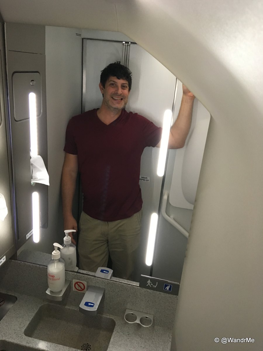 Other “outsized” components of the aircraft include the wide aisle and the massive lav at the rear. It is the largest single-aisle lav I can recall being in. Seriously a ton of space in there.