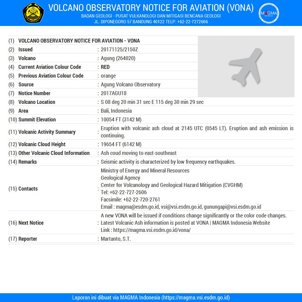 Indonesia’s Volcano Observatory raised the alert level to RED for Mt. Agung due to ash cloud